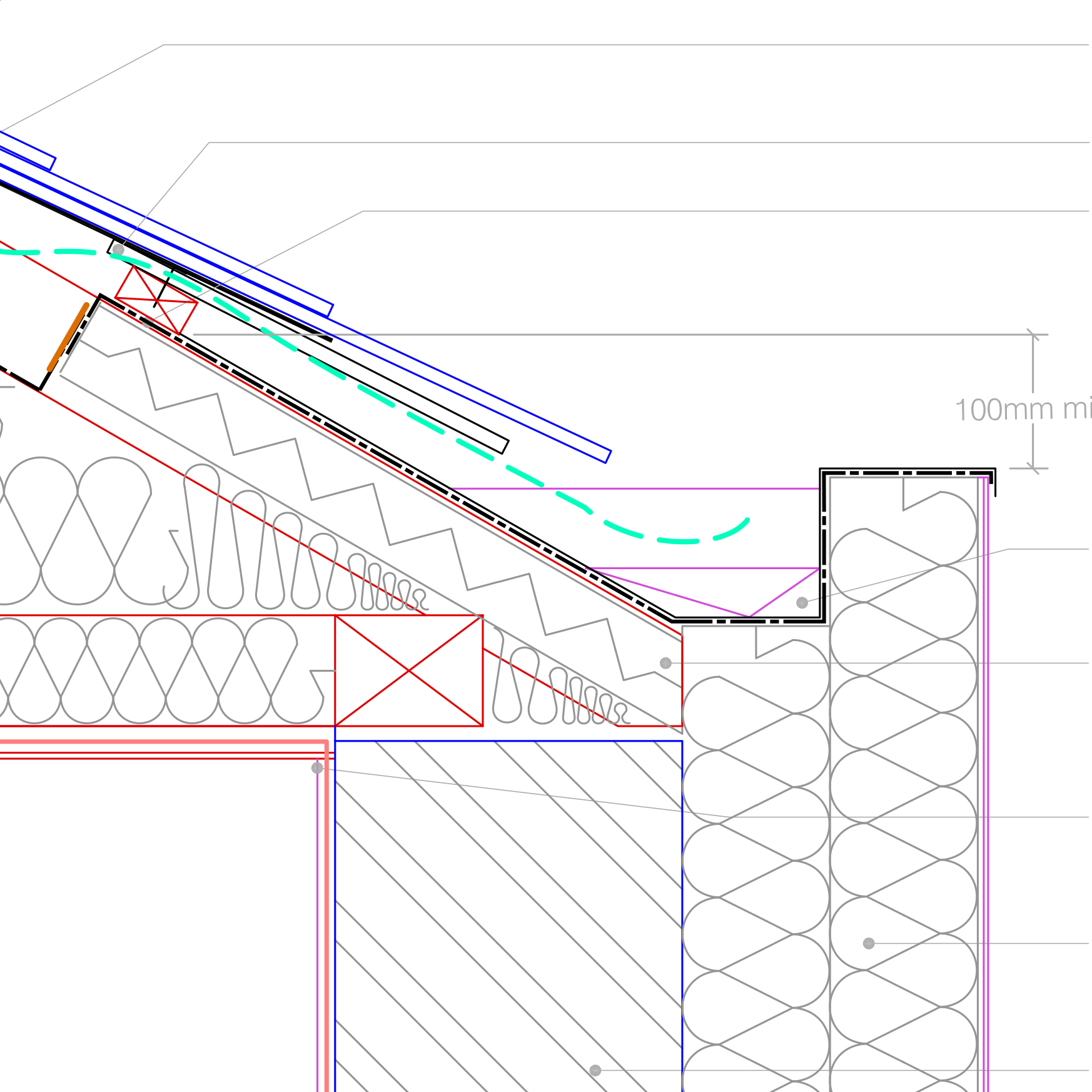 Roof underlay. Sealed to phenolic foam insulation and dressed to drainage point at the end of each run of guttering to allow water to exit construction.