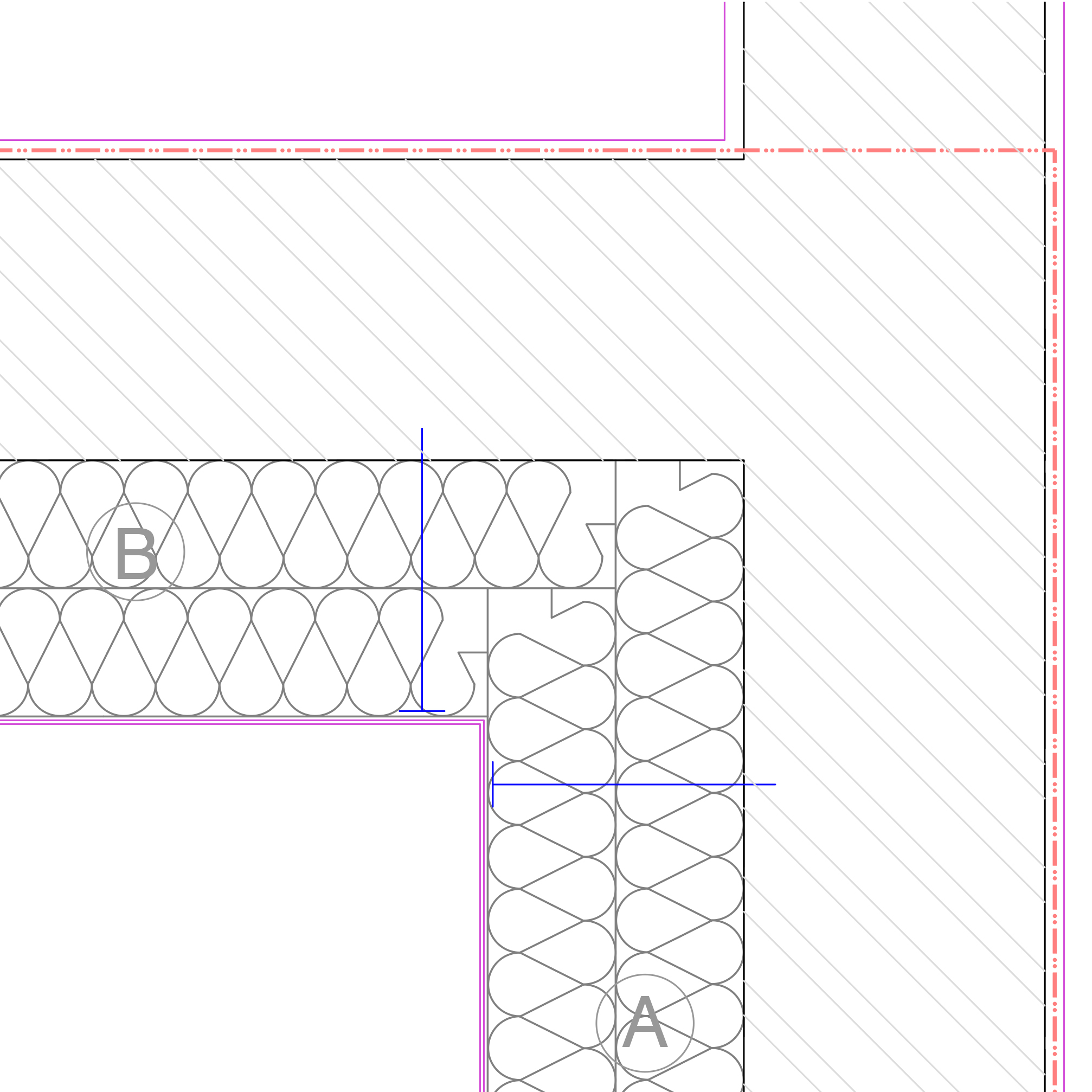 Plan detail. EWI to internal corner with external perpendicular wall. Continuous insulation around corner to prevent thermal bridging with butted joints between insulation and continuous render over.
