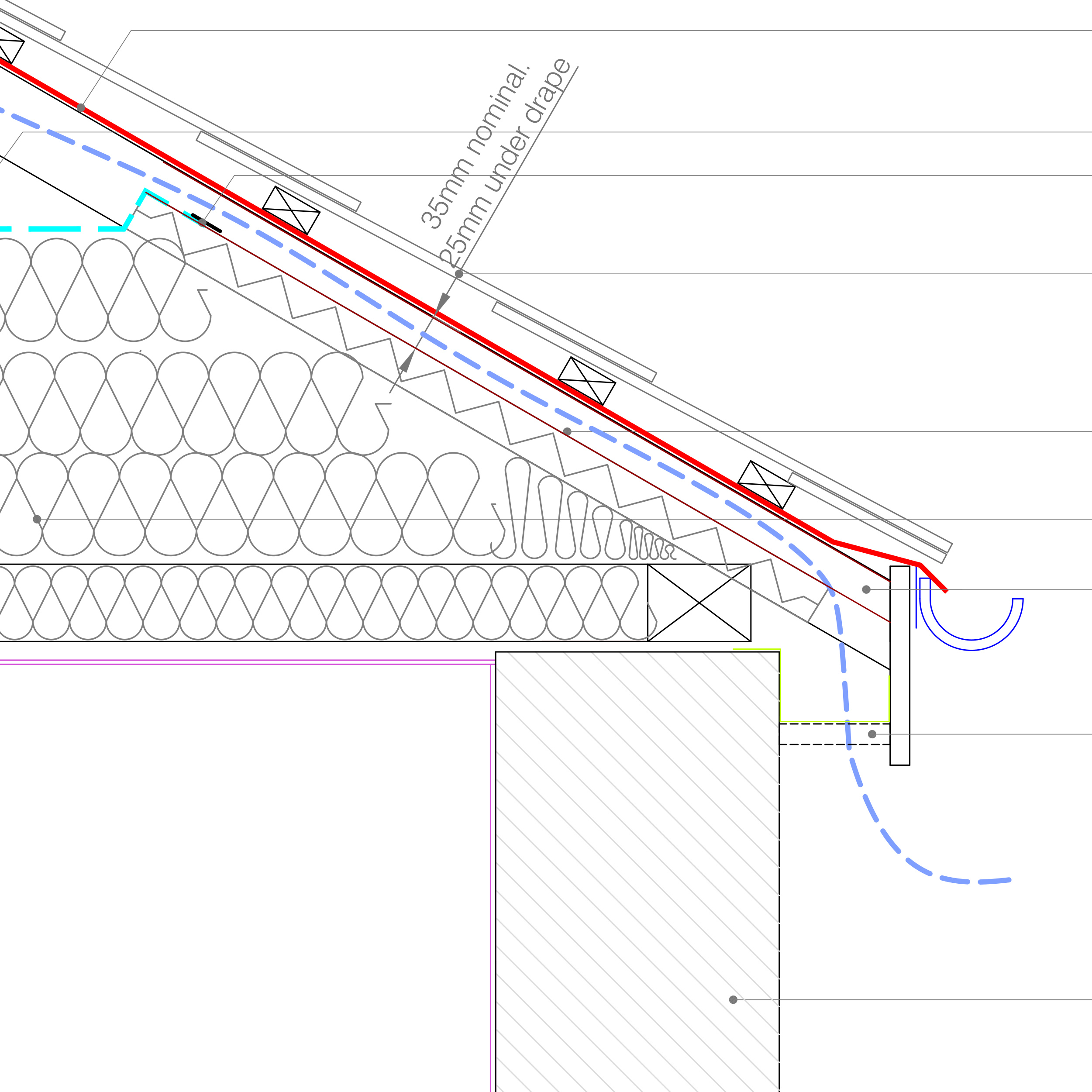 Section detail. Roof & Loft insulation. To eaves. Installed internally at junction with wall insulation.